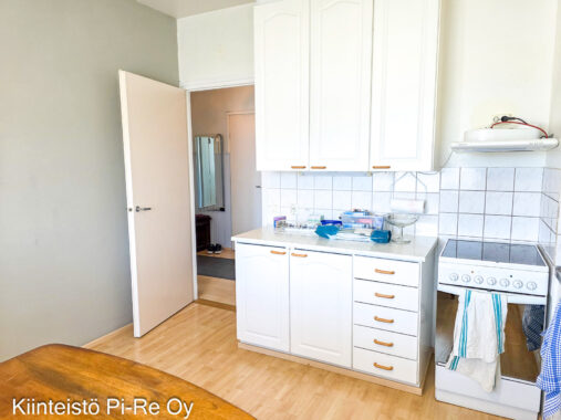| Keittiö: | Jääkaappi/pakastin, liesi, liesituuletin ja astianpesukone. Lattiassa laminaatti ja seinät maalatut. Keittiöön mahtuu hyvin ruokapöytä. |