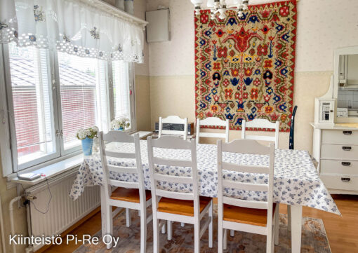 | Keittiö: | KEITTIÖ: Tilava, valoisa keittiö, jonka lattiassa laminaatti, seinät tapetoidut, valkoiseksi maalattu paneelikatto ja työtasojen välitilassa vaalea laatta. Varustuksena liesi, liesituuletin, jääkaappi/pakastin ja astianpesukone. |