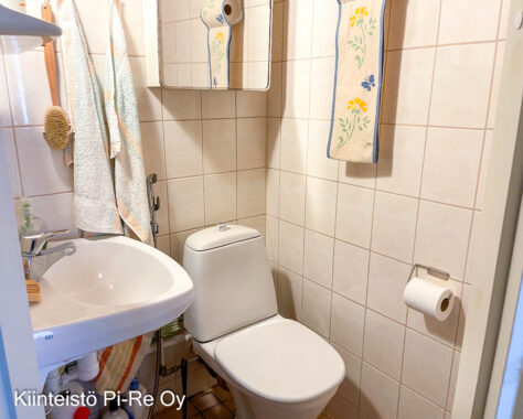 Pesu / wc-tilat:Eteisestä ja makuuhuoneesta kulku wc-tilaan, jossa lattia laatoitettu, seinät kaakeloidut ja katto paneloitu. Käsienpesuallas ja peilikaappi. Eteisestä käynti suihkutilaan, jossa myös vesivaraaja. Sielläkin lattia laatoitettu ja seinät kaakeloidut.